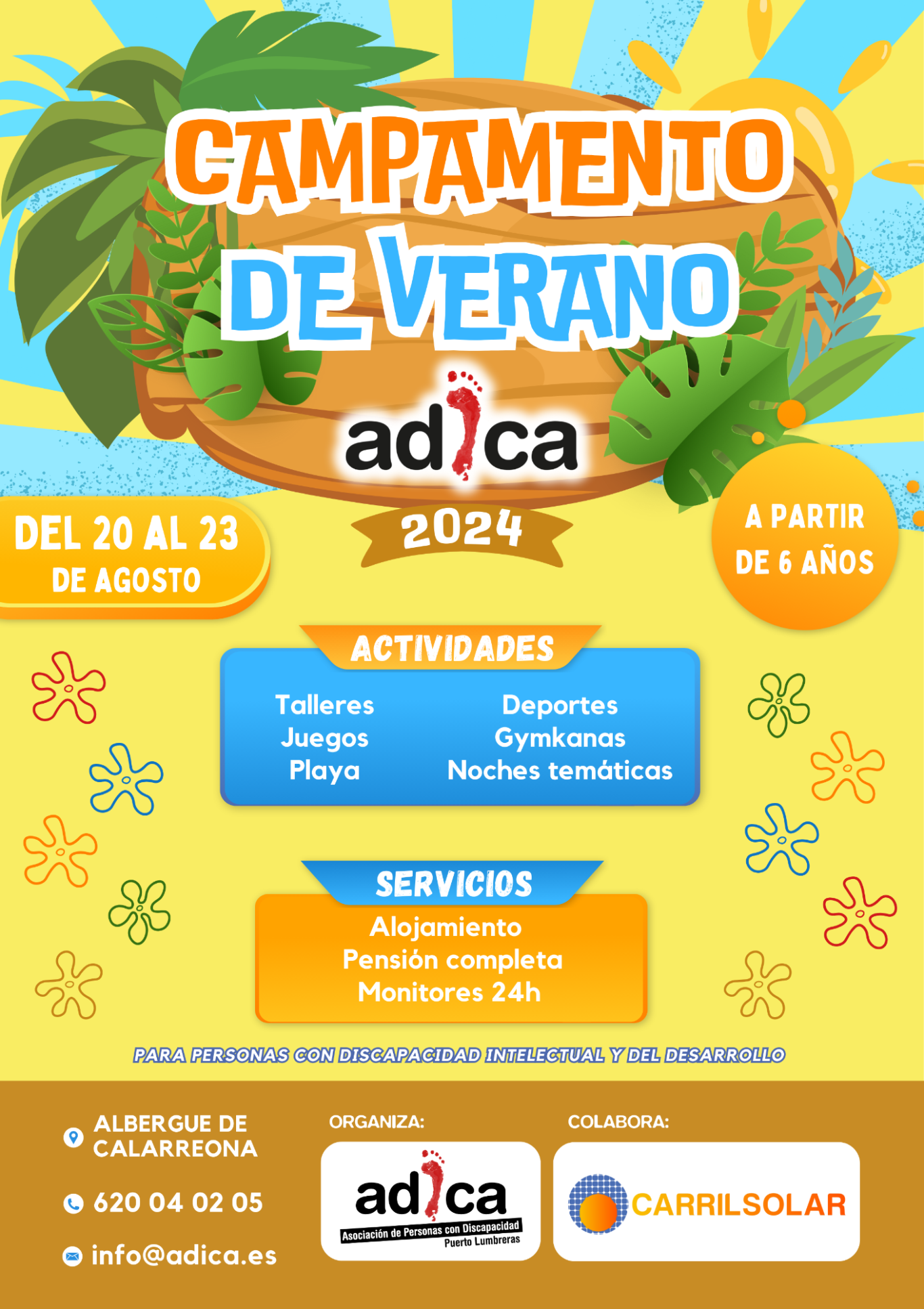 🟡 CAMPAMENTO DE VERANO. Se llevará a cabo del 20 al 23 de agosto en el Albergue Juvenil de Calarreona. Un espacio perfecto donde nuestros chicos y chicas podrán pasar unos días de playa, ocio y disfrute, facilitando al mismo tiempo un respiro a las familias.