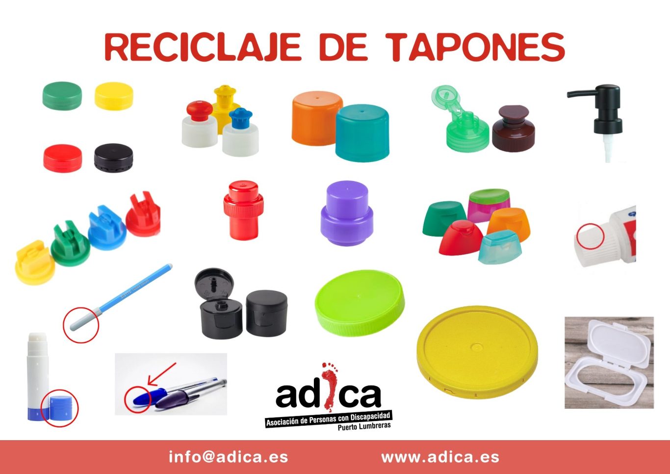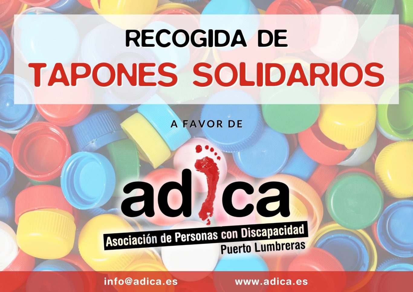 ADICA tiene en marcha una campaña de Recogida de TAPONES DE PLÁSTICO, destinados a una planta de reciclaje del municipio de Puerto Lumbreras ♻️