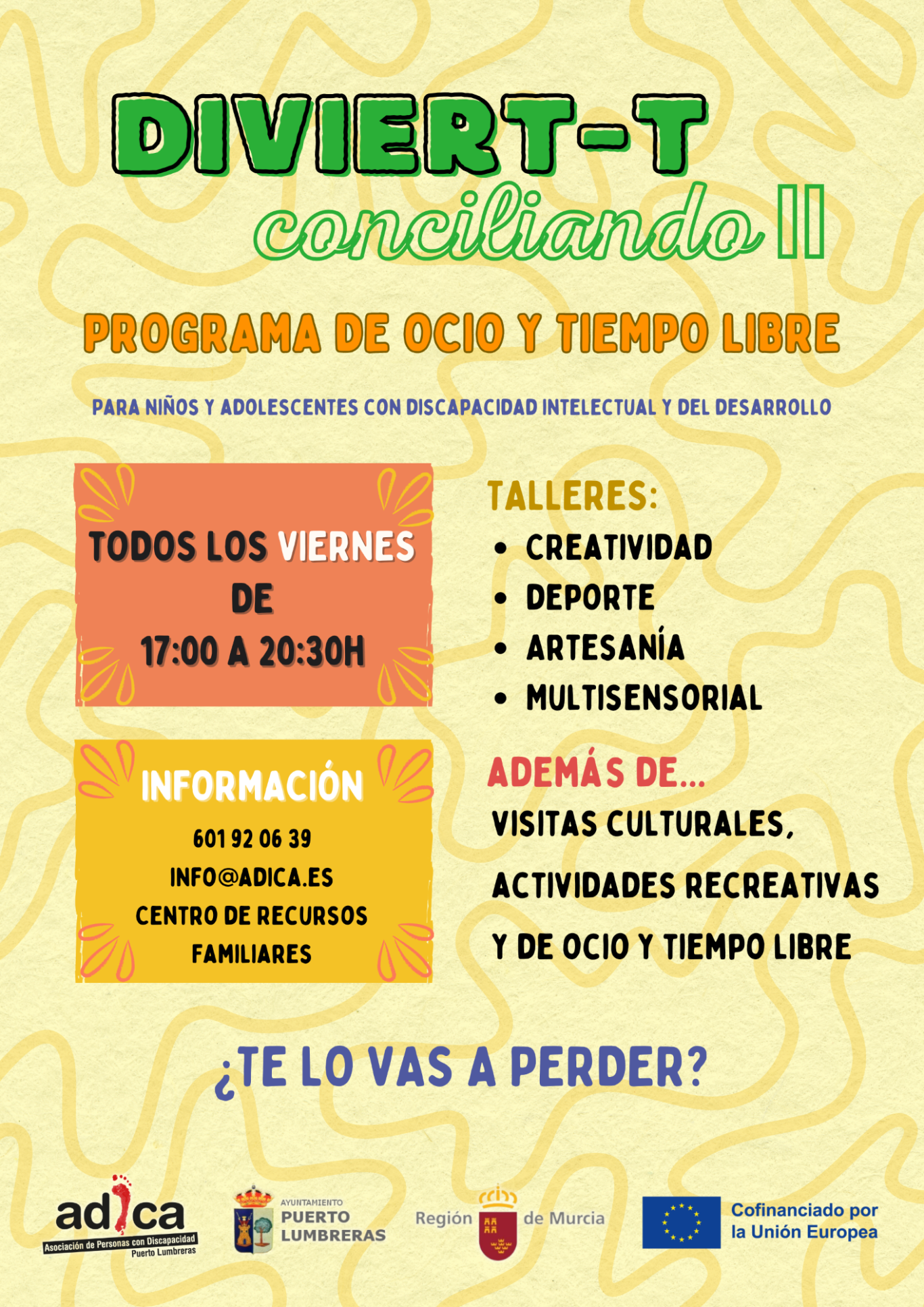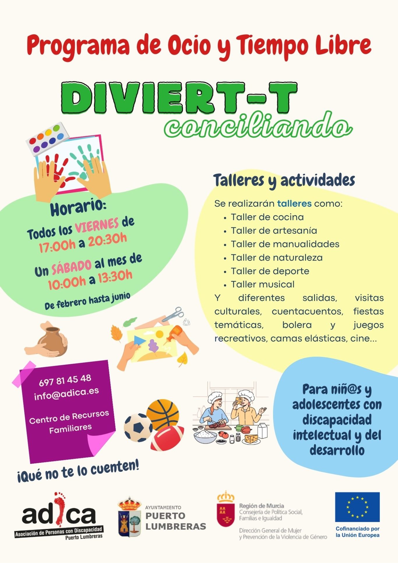 ADICA, en colaboración con el Ayuntamiento de Puerto Lumbreras y con la Consejería de Política Social, Familias e Igualdad, va a poner en marcha un Programa de Ocio y Tiempo Libre llamado “DIVIERT-T conciliando” destinado a niños, adolescentes y personas adultas con discapacidad intelectual y del desarrollo.