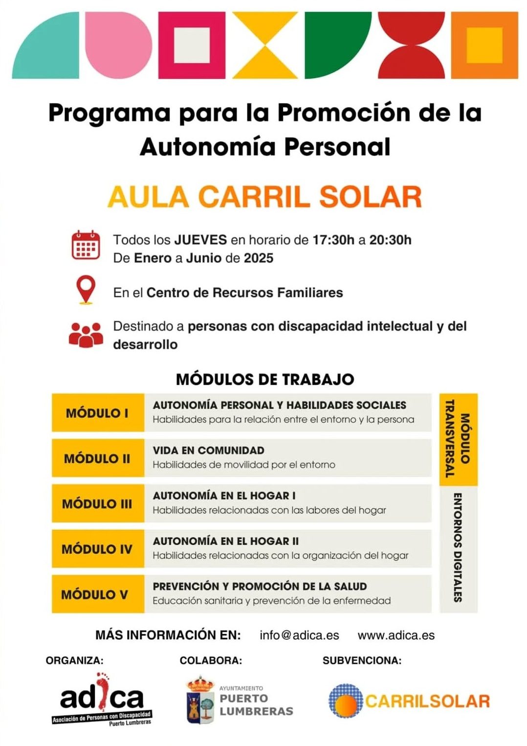Presentamos el Programa de Autonomía Personal AULA CARRIL SOLAR. Un proyecto que llevará a cabo nuestra asociación, con la colaboración del Ayuntamiento de Puerto Lumbreras y que será financiado por la empresa Carril Solar.
