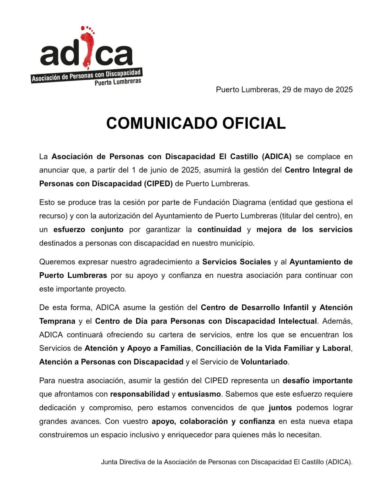 La Asociación de Personas con Discapacidad El Castillo (ADICA) ha asumido, con fecha 1 de junio de 2025, la gestión del Centro Integral de Personas con Discapacidad (CIPED) de Puerto Lumbreras.